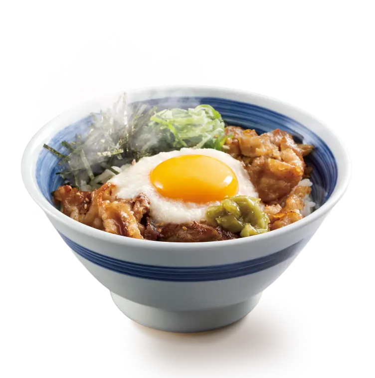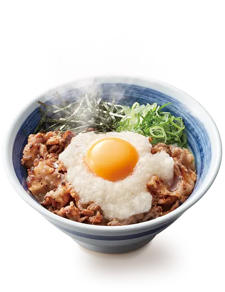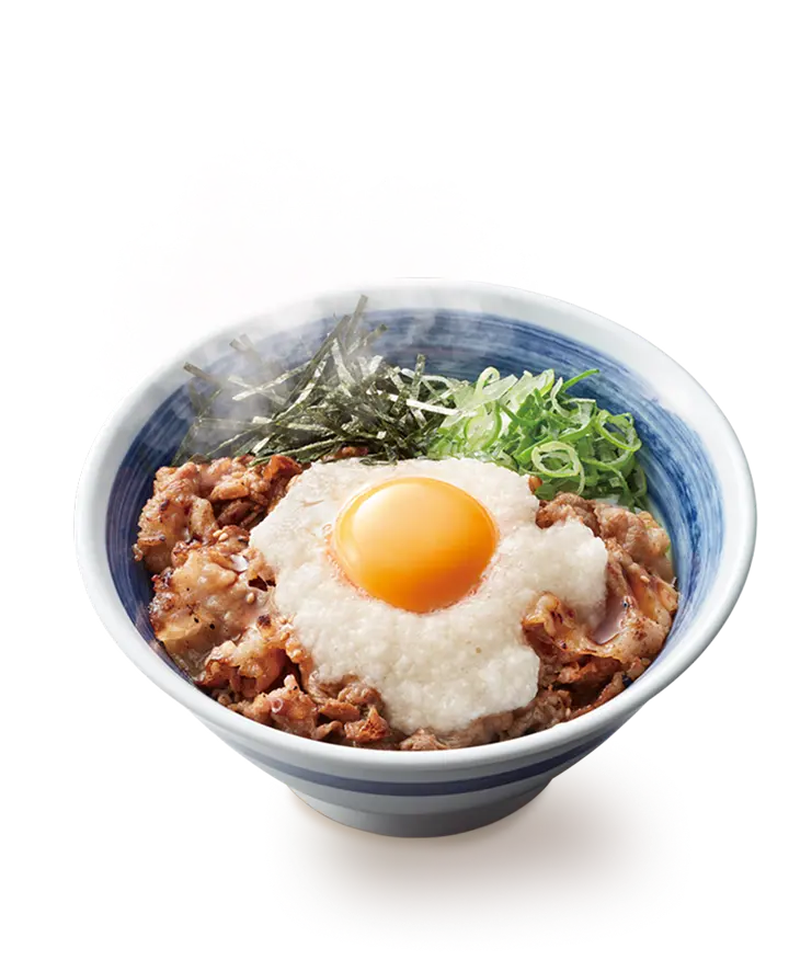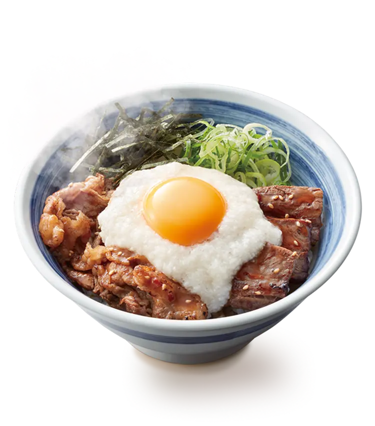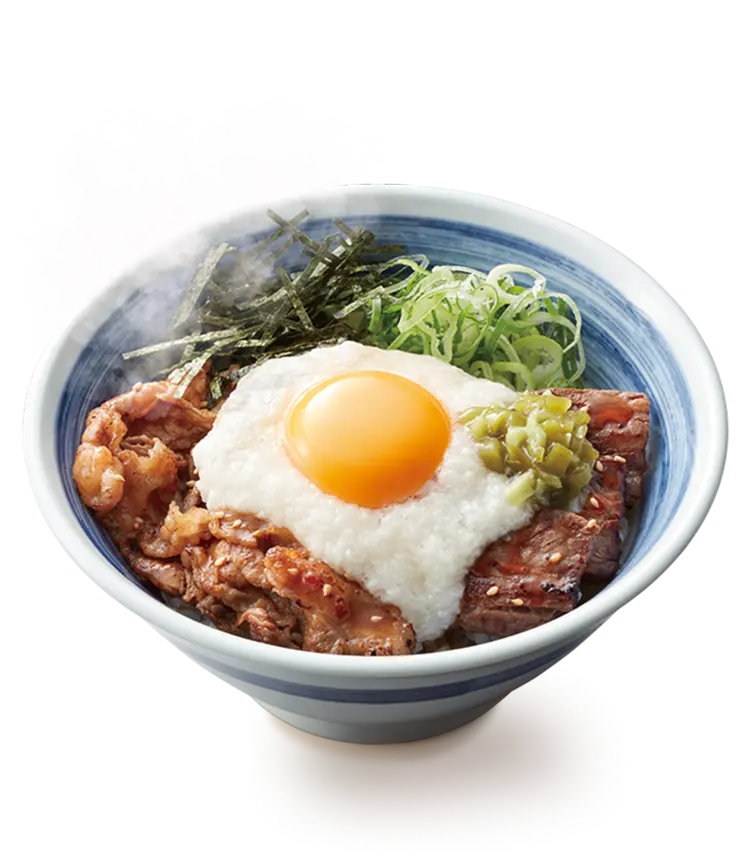 厳選した熟成牛バラ肉を香ばしく焼き上げ、たっぷりの月見とろろを合わせました。鰹節の旨味、香りが効いた特製だれと一緒にお召し上がりください。
