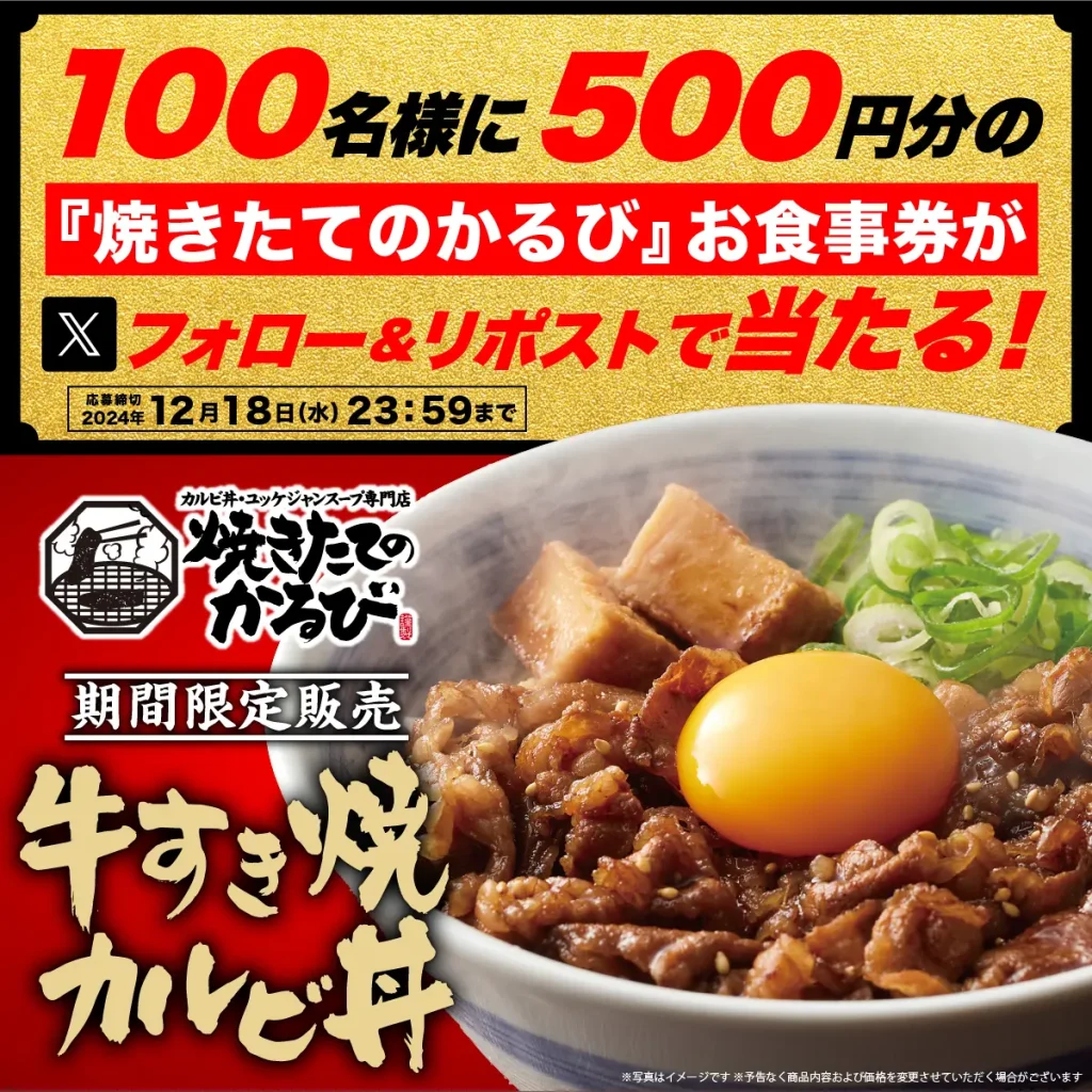2024 12.13 牛すき焼カルビ丼発売記念キャンペーン開催! 牛すき焼カルビ丼販売記念フォロー&リポストキャンペーンを開催します! \参加はこちら/ https://x.com/yakitatenokalbi?utm_source=web&utm_medium=push&utm_campaign=x 100名様に抽選で「アプリクーポン500円」をプレゼント! 皆様のご参加お待ちしております!!