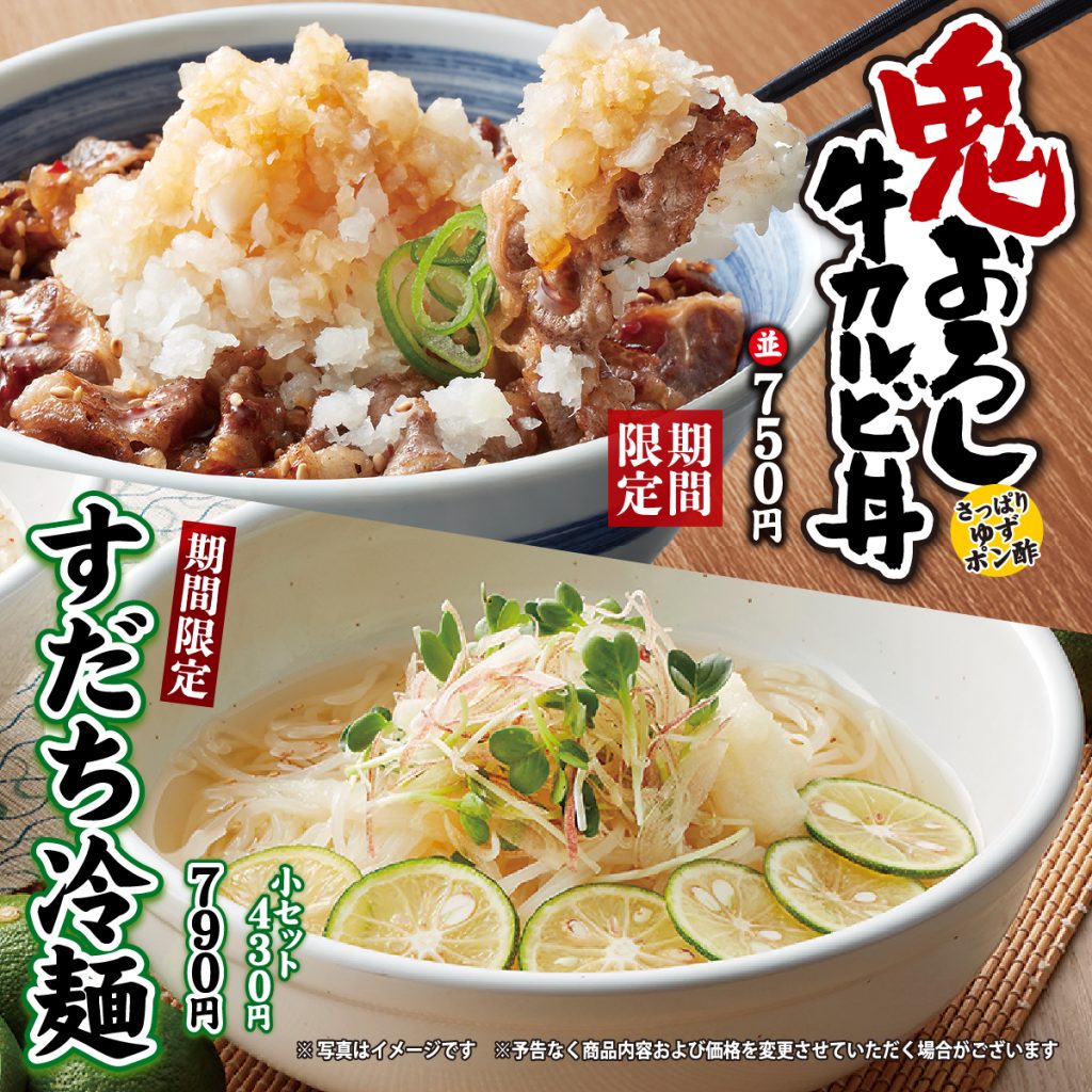 2025 6.5 6月12日(木)より期間限定「鬼おろし牛カルビ丼」「鬼おろし豚カルビ丼」「鬼おろし黒毛牛カルビ丼」と「すだち冷麺」が販売開始! 2025年6月12日(木)より「鬼おろし牛カルビ丼」「鬼おろし豚カルビ丼」「鬼おろし黒毛牛カルビ丼」と「すだち冷麺」の4商品を期間限定で販売いたします。 【販売期間】 2025年6月12日(木)〜2025年7月中旬まで ※「すだち冷麺」は2025年6月12日(木)〜2025年8月下旬まで 詳しくはこちら