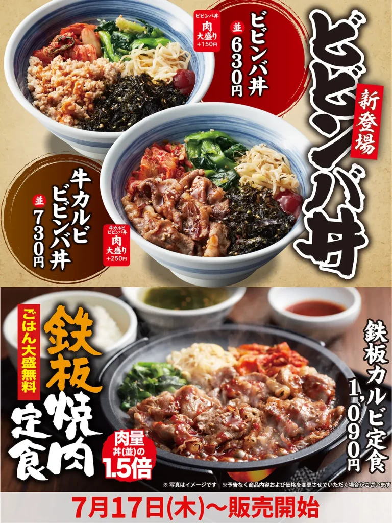 2025年7月17日(木)、グランドメニューリニューアルで「ビビンバ丼」「鉄板焼肉定食」が登場!