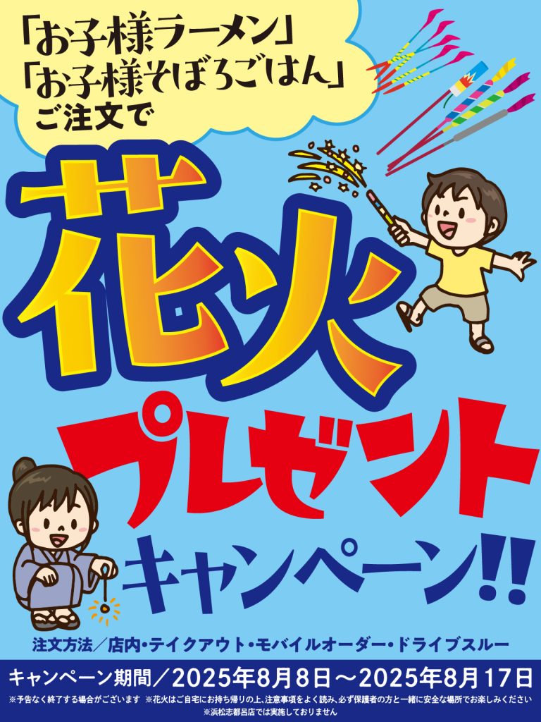 対象商品(お子様ラーメン・お子様そぼろごはん)を1つご注文いただくごとに、花火セットを1つ差し上げます。