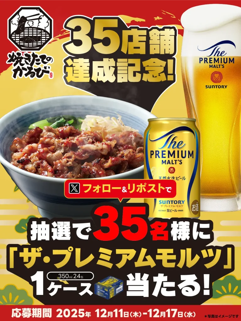 2025 12.11 「35店舗達成記念」フォロー&リポストキャンペーン開催! 🍖🍚「35店舗達成記念」フォロー&リポストキャンペーンを開催します🎉😊 \参加はこちら/ https://x.com/yakitate_kalbi?utm_source=sns&utm_medium=hp&utm_campaign=x 35名様に抽選で「ザ・プレミアムモルツ1ケース」をプレゼント🎁 皆様のご参加お待ちしております✨