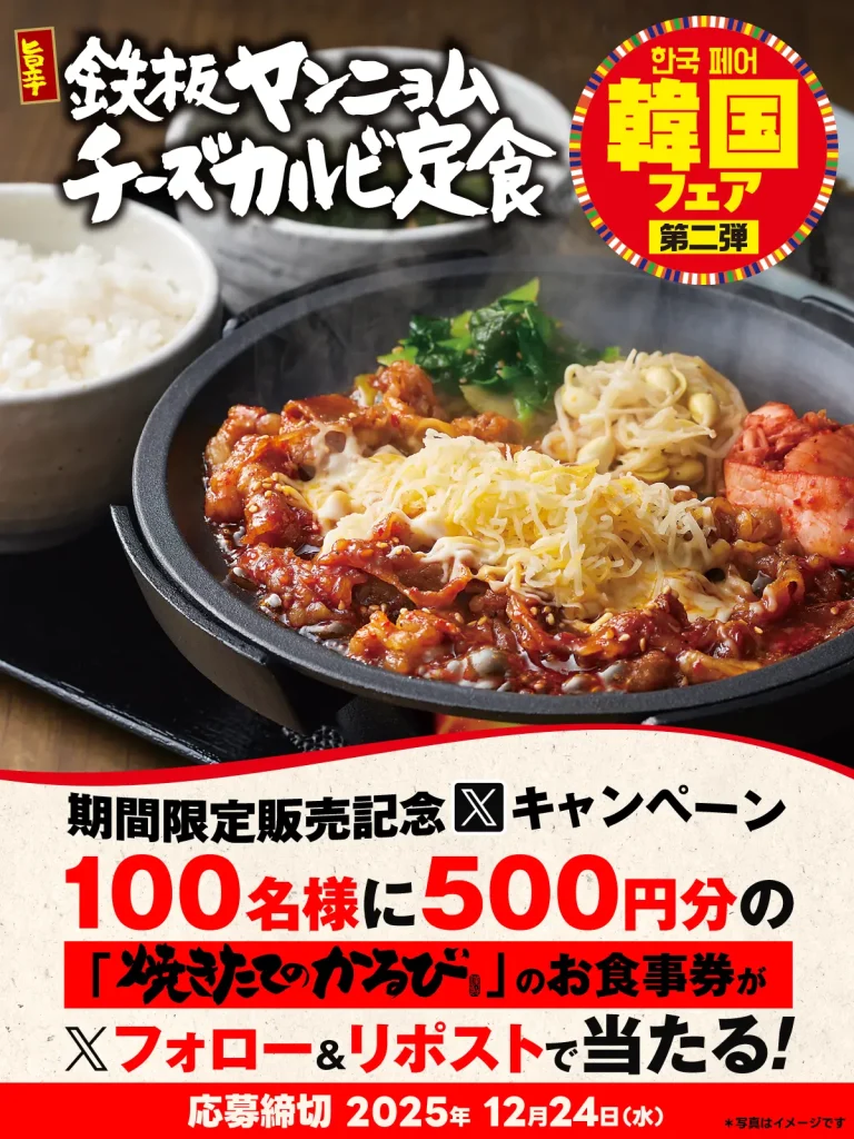 2025 12.18 「韓国フェア第二弾」販売記念キャンペーン開催! 🍖🍚「韓国フェア第二弾」販売記念キャンペーンを開催します🎉😊 \参加はこちら/ https://x.com/yakitate_kalbi?utm_source=sns&utm_medium=hp&utm_campaign=x 100名様に抽選で「アプリクーポン500円」をプレゼント🎁 皆様のご参加お待ちしております✨