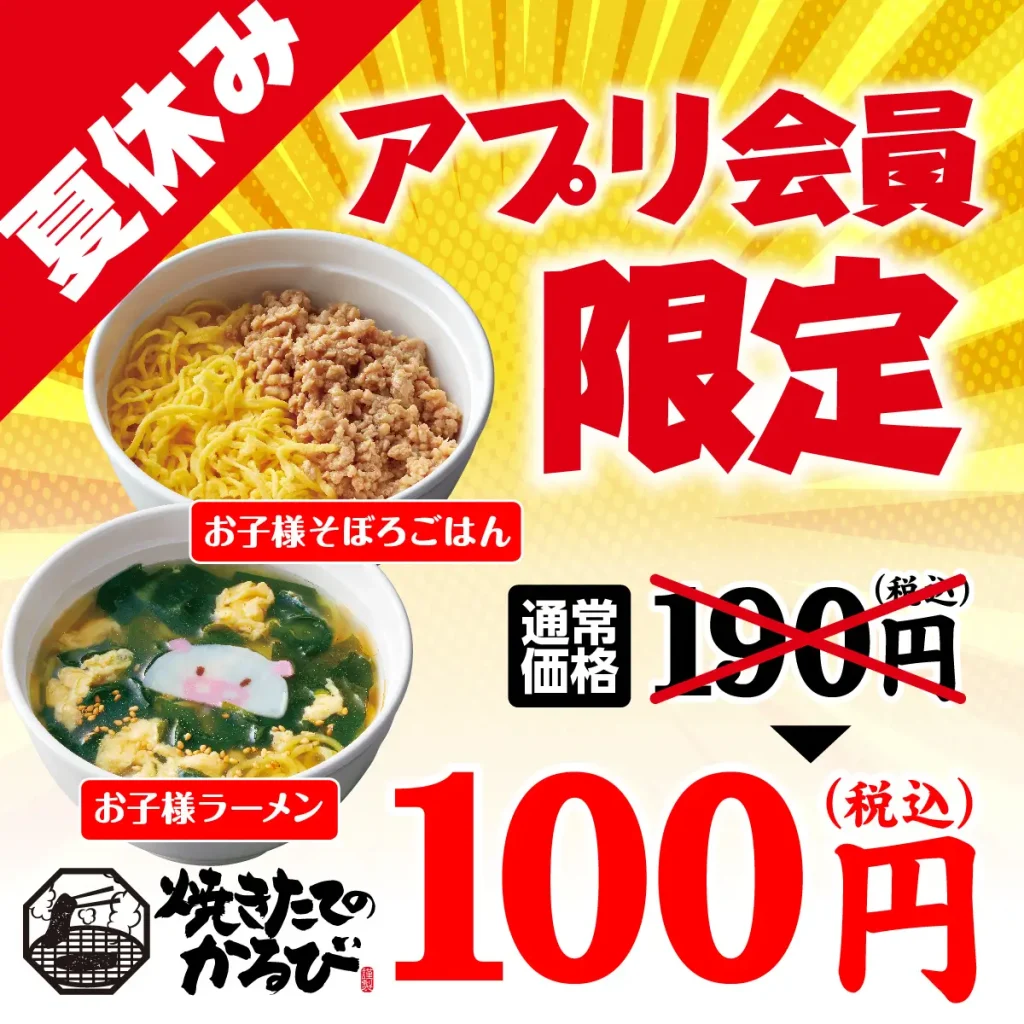 2024年8月9日(金)から2024年8月18日(日)までの間、『焼きたてのかるび』公式アプリで、おこさまメニューを100円(税込)でご注文できるアプリクーポンを配信いたします。