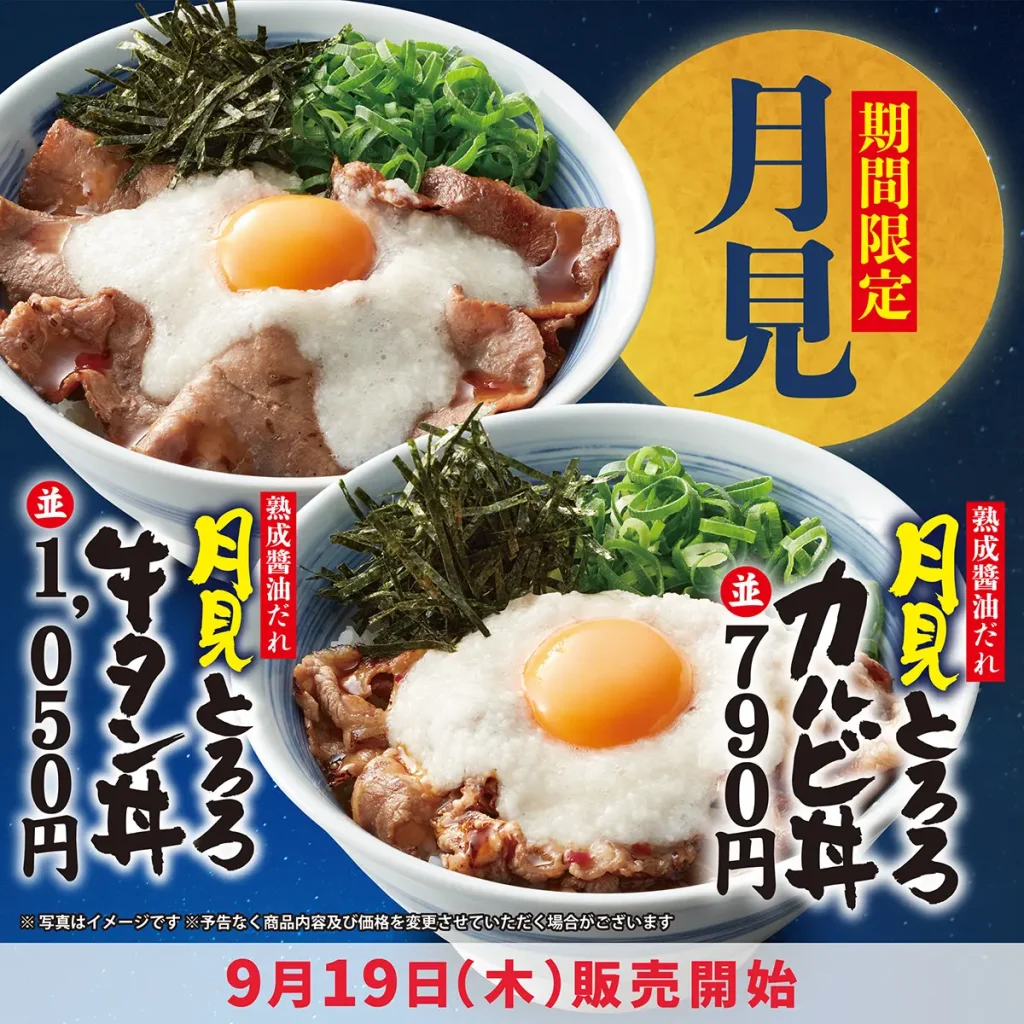 2024 9.11 9月19日(木)より「月見とろろカルビ丼」「月見とろろ牛タン丼」「特製カルビ玉子スープ」を期間限定で販売開始! 2024年9月19日(木)より期間限定商品の「月見とろろカルビ丼」「月見とろろ牛タン丼」「特製カルビ玉子スープ」を販売いたします。 詳しくはこちら